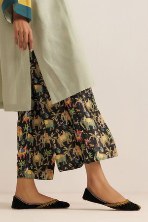 A black Mughal miniature printed silk fabric culottes create a stunning and unique look.