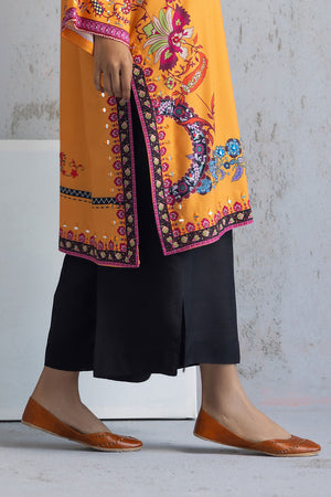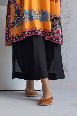 A khaddi silk black culottes with a plain and stylish saddle look, Adding a side slit to the culottes will give them a touch of allure and make them even more fashionable.