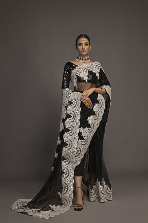 A black net eye-catching sari enhances a touch of sophistication and mystery, while the sequence blouse add a pop of shimmer and shine.