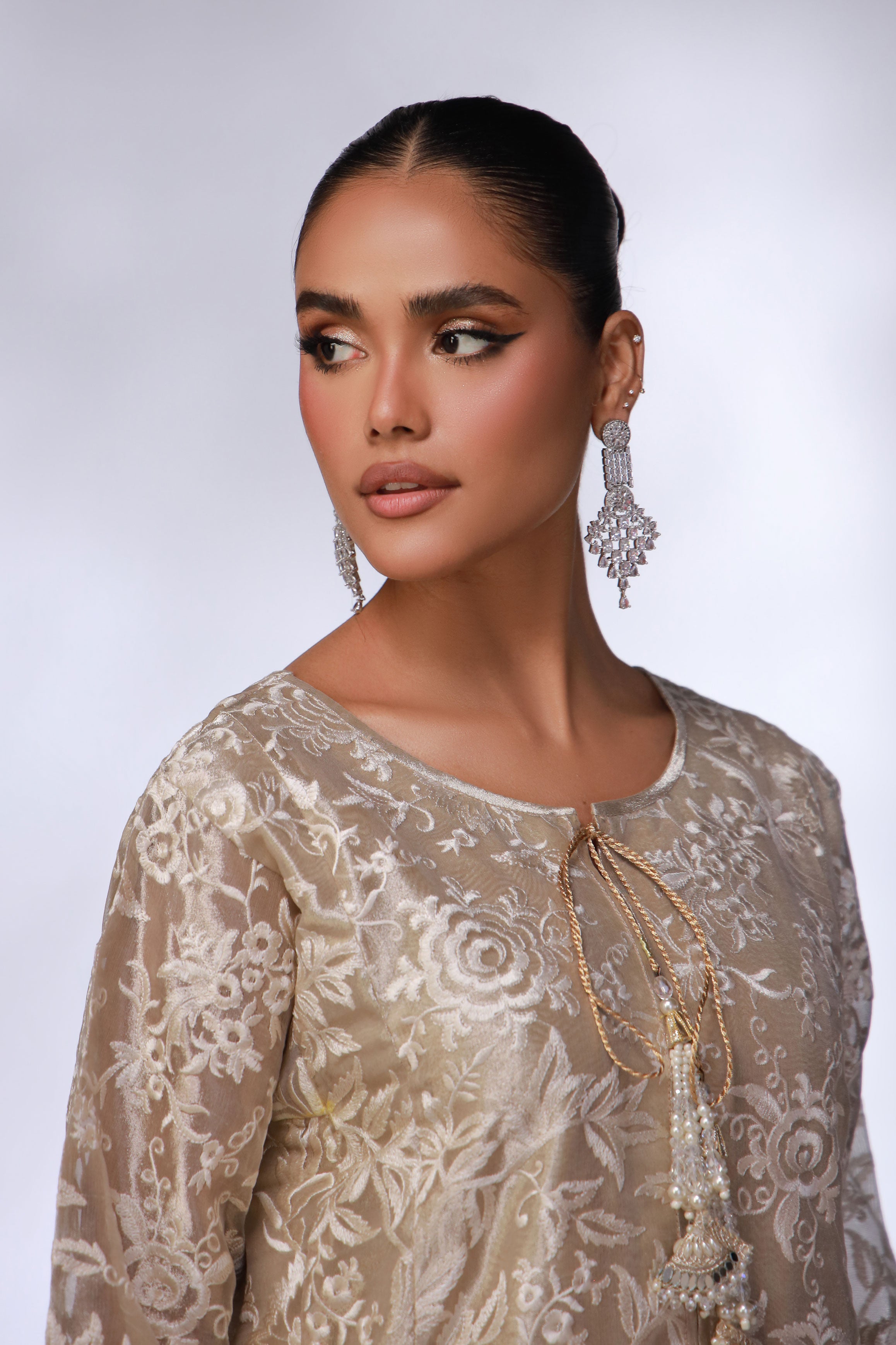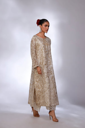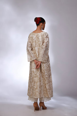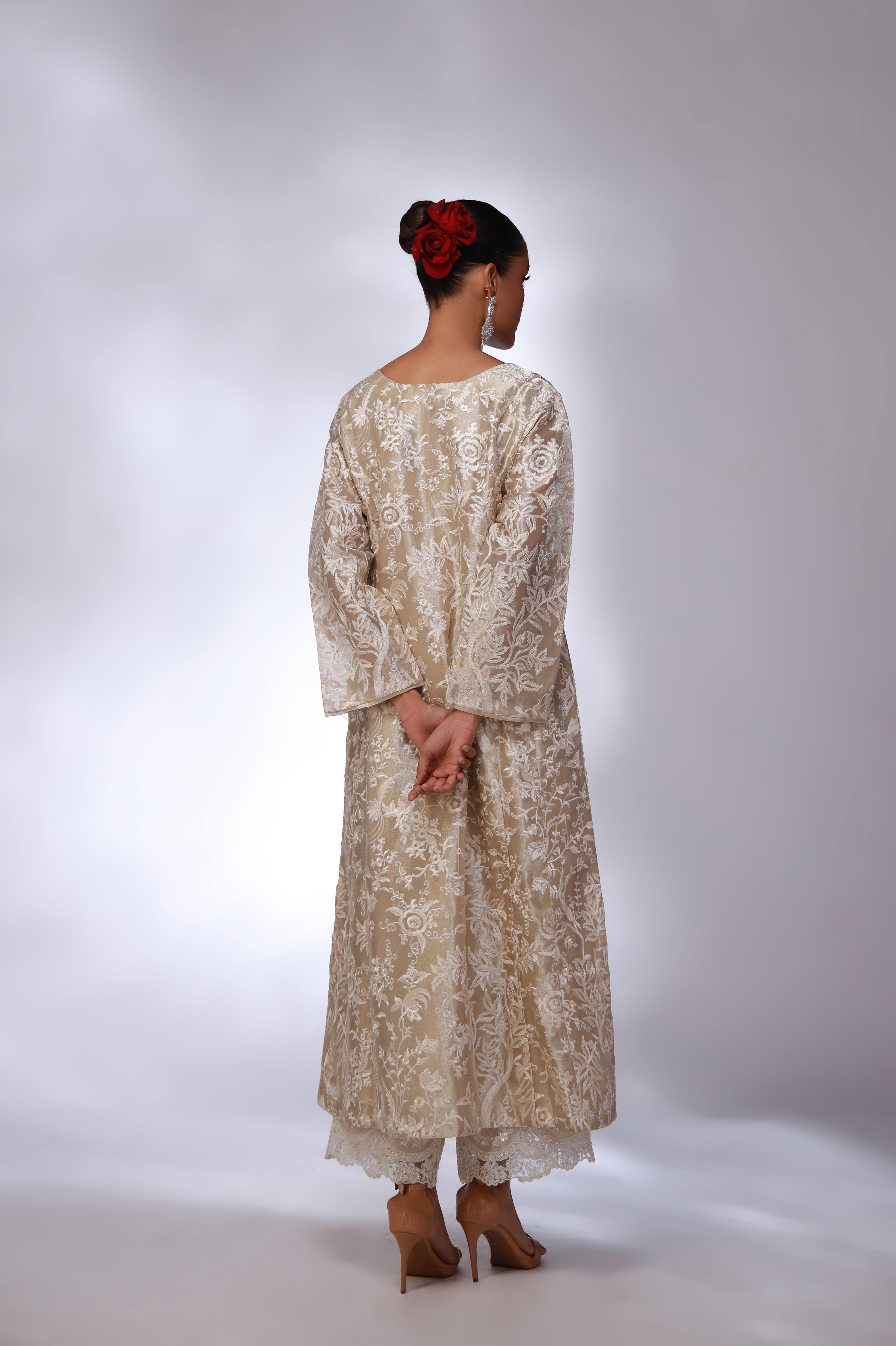 Shirt: A beige lama shirt, intricately detailed with heavy embroidery and hand tassel work, creating a rich and elegant look.