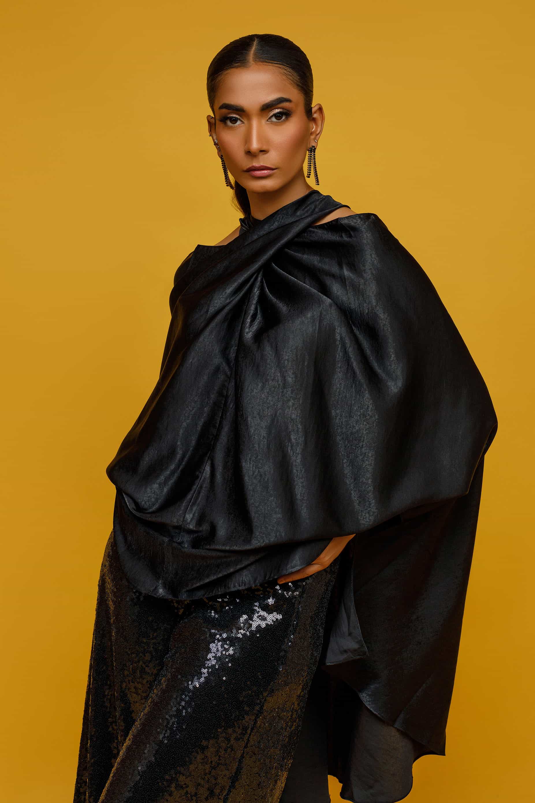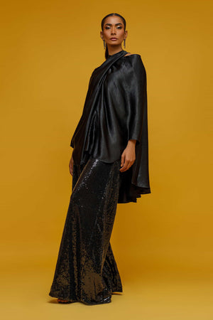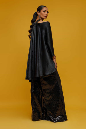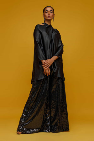 This black fusion silk top with black sequin bootleg pants! It's such a chic and glamorous combination. The fusion silk top adds a touch of elegance, while the black sequin bootleg pants bring a bit of sparkle and flair. Together, they create a stylish and sophisticated outfit that's perfect for a night out or a special occasion. You'll make a statement in that ensemble..