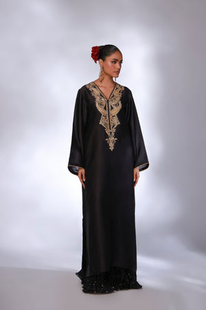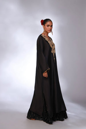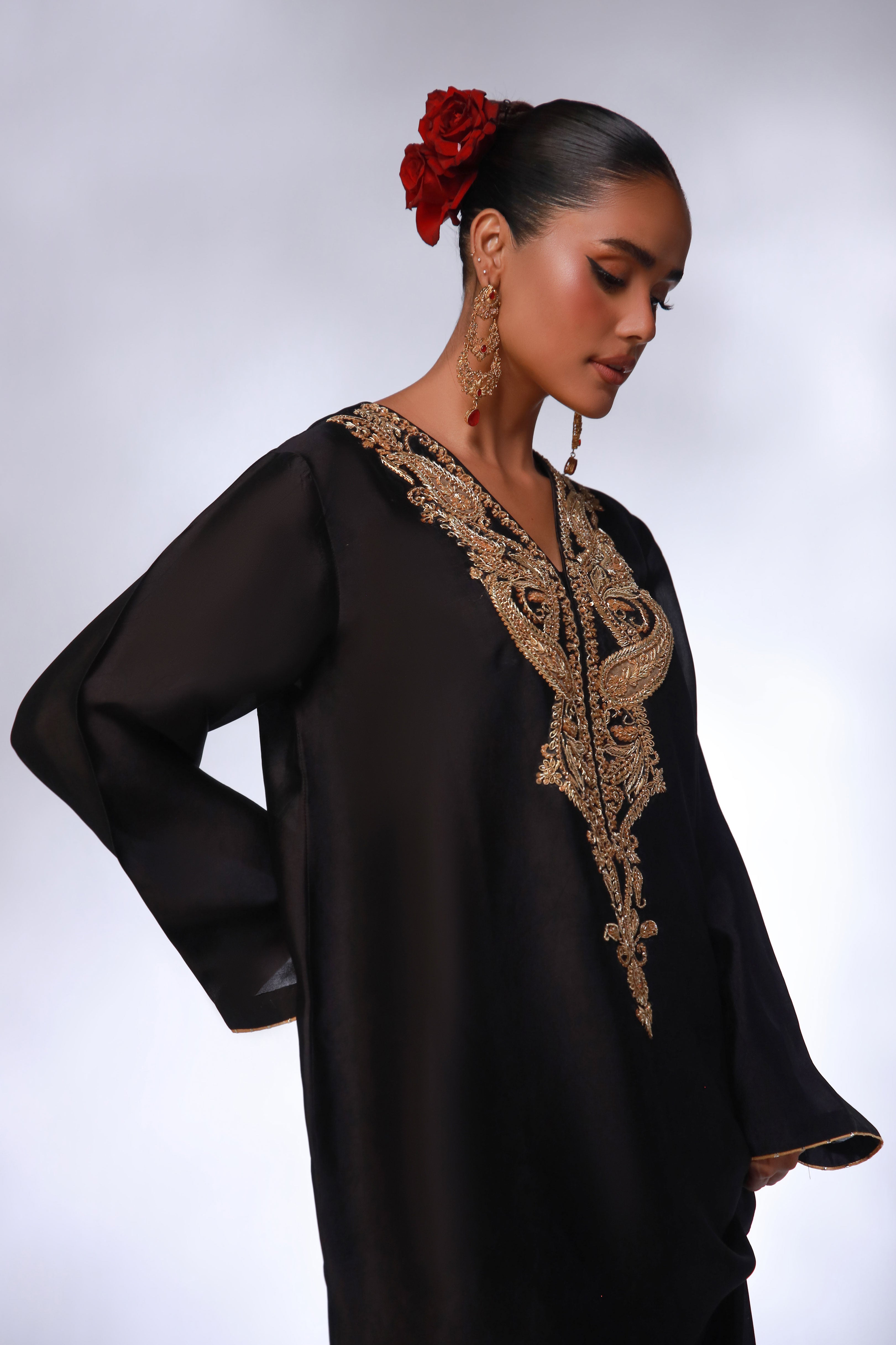 Shirt: A black pure shisha silk jalabiya, adorned with intricate hand zardozi work on the neck, complemented by applique detailing and finished with delicate gotta work for an elegant touch.