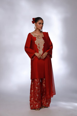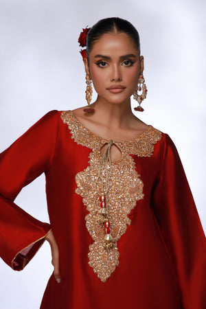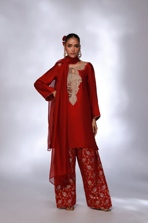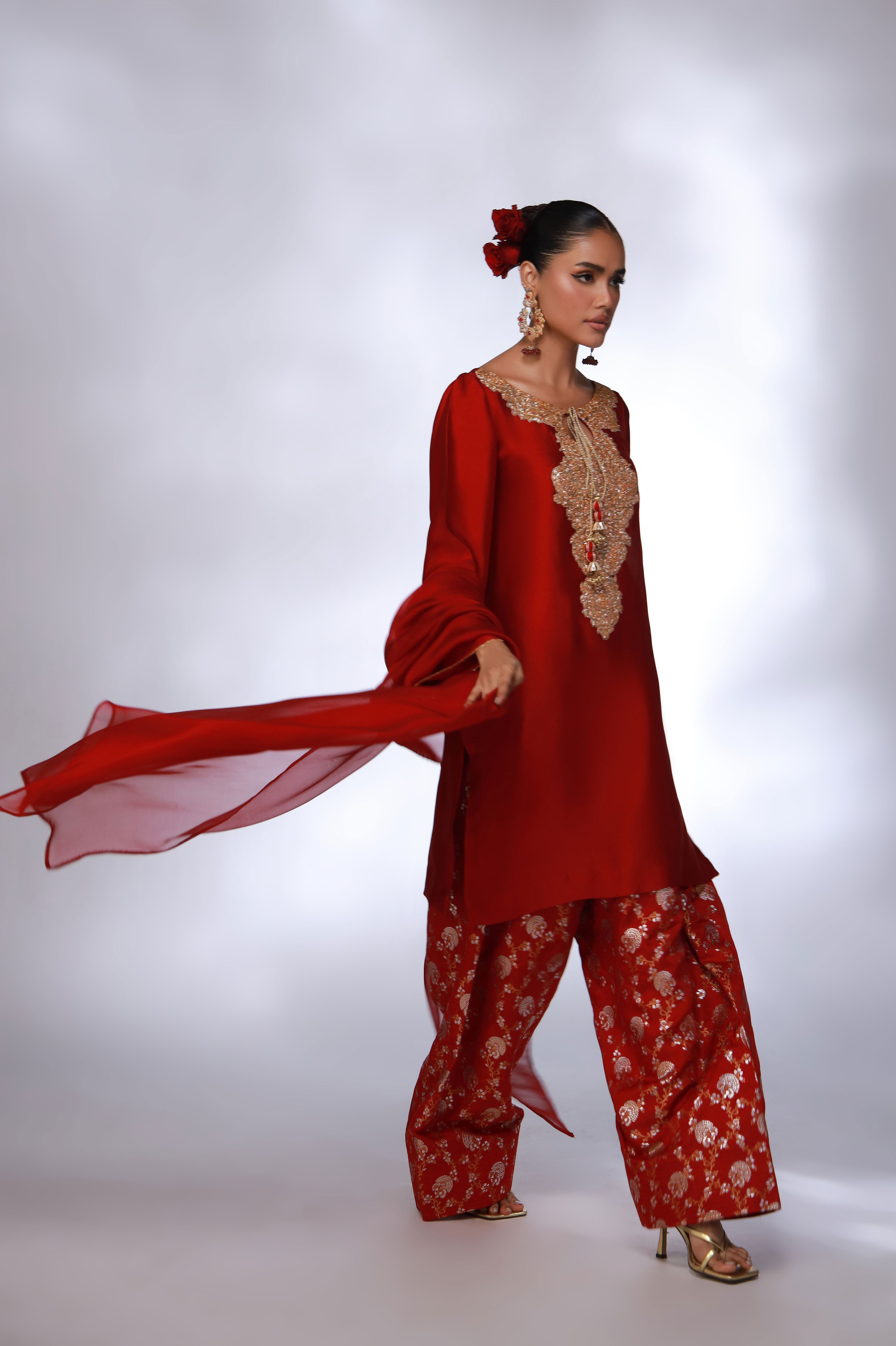 Shirt: A blood red pure shisha silk shirt featuring intricate hand-embroidered gotta work on the neck, designed in a keyhole style with tasseled detailing. The short length adds a stylish element to this elegant piece.