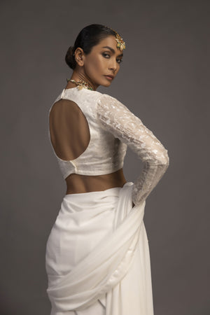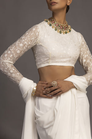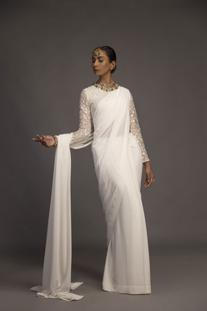 A white double georgette sari adds a touch of purity and simplicity, while the embroidered blouse assembles a delightful and timeless outfit sufficient for any formal occasion.