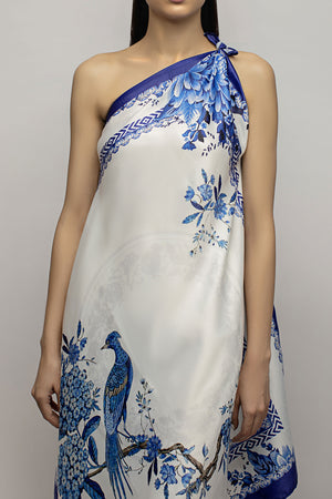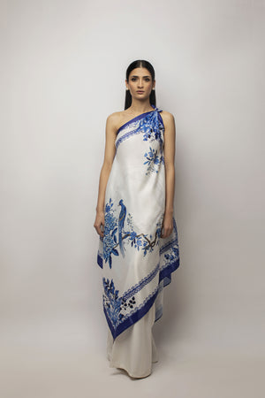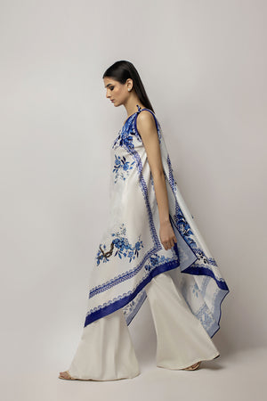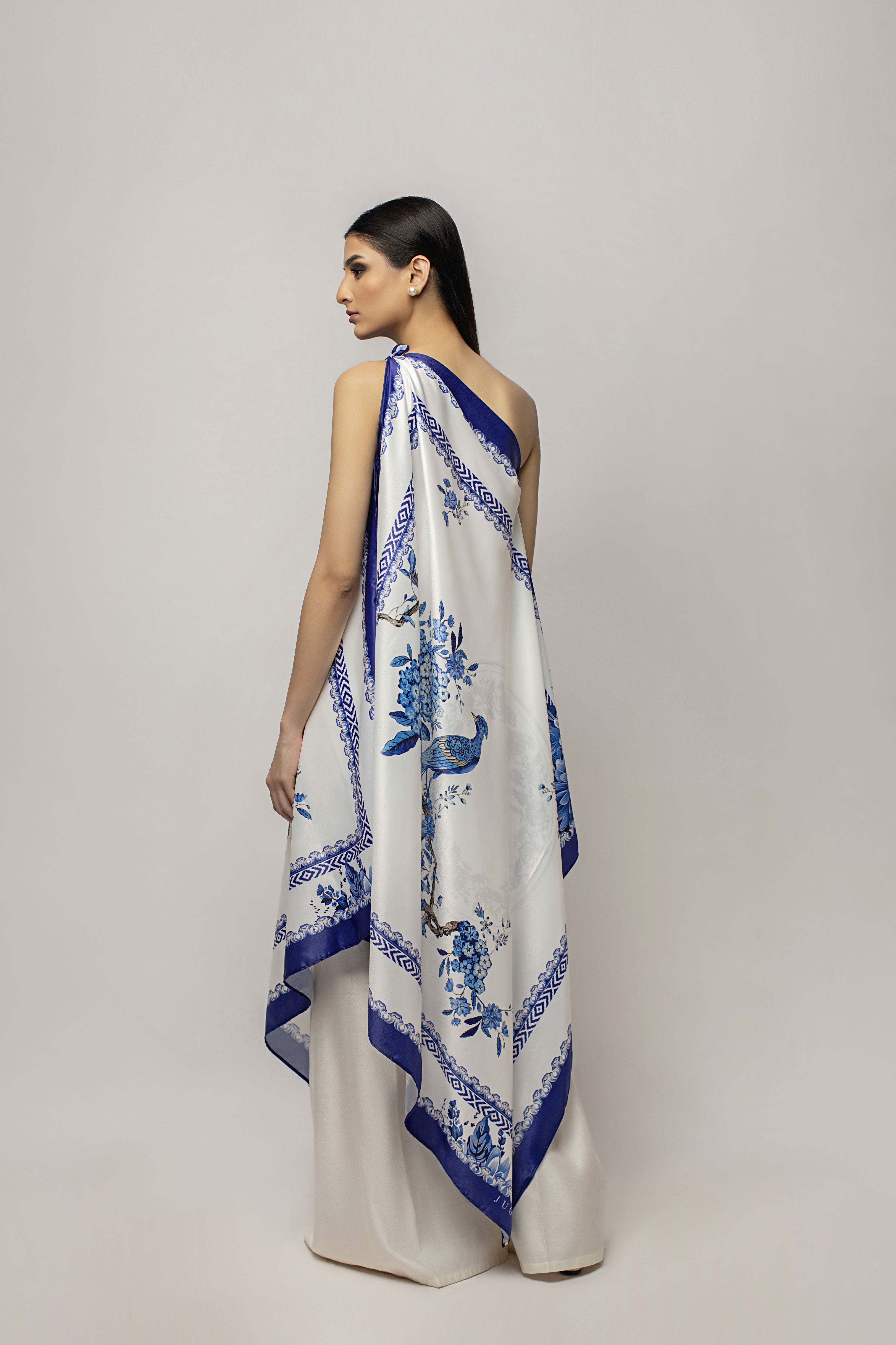 A one-shoulder free size silk tunic, rendering a decent look in blue floral print paired with white khadi silk bootleg pants. Wear this on your special day with your loved one.