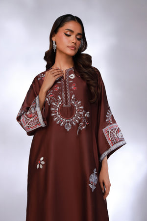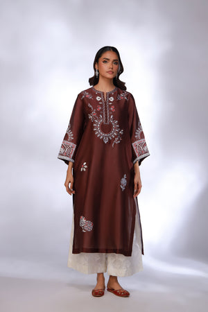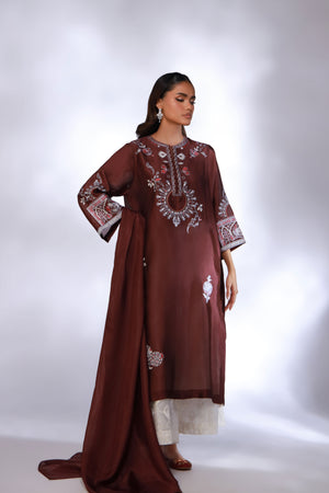 SHIRT: A burgundy , shisha silk shirt enhanced with embroidery on the front and sleeves made complete with silk dupatta.