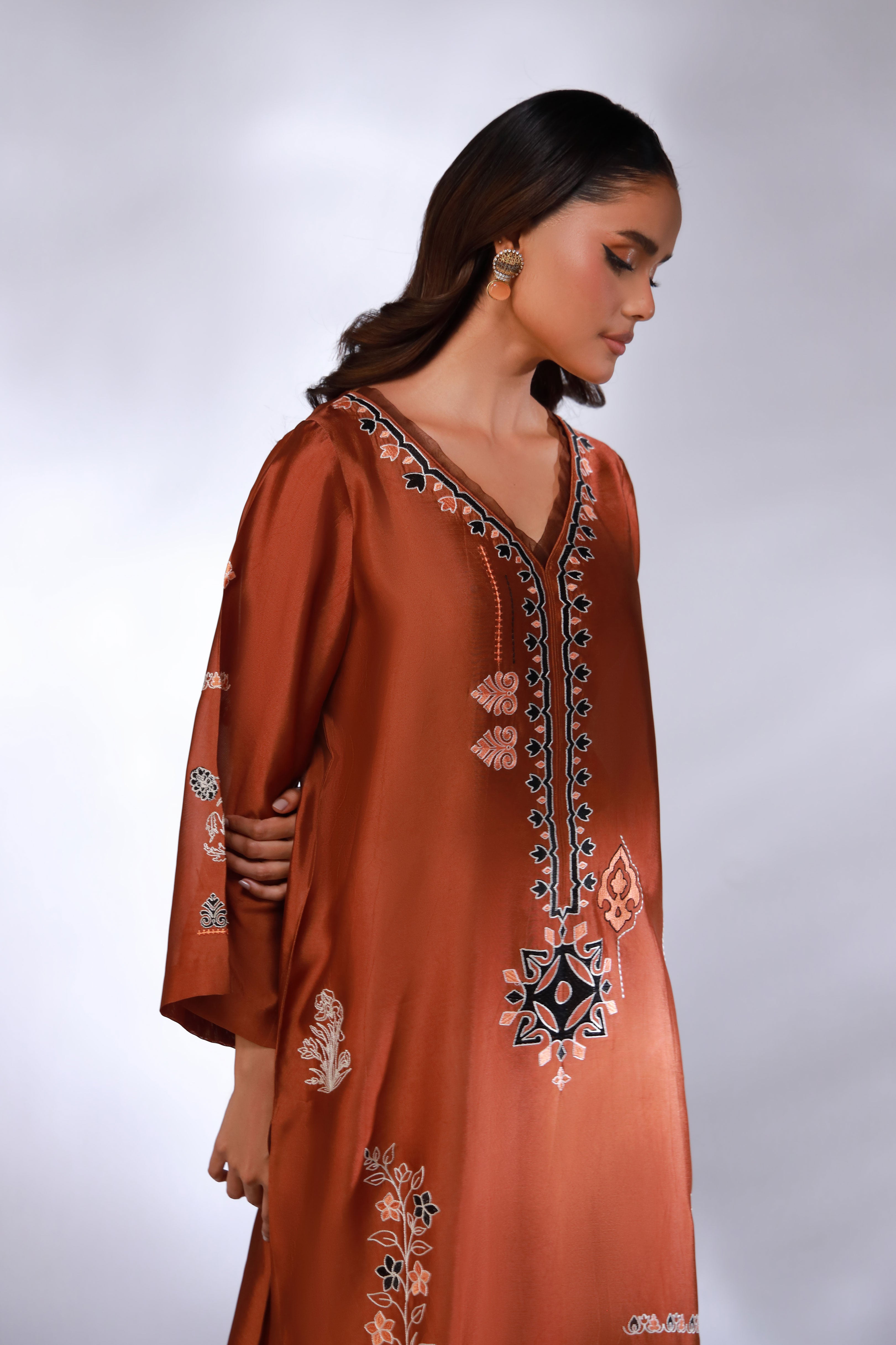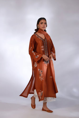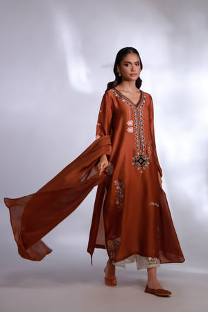 SHIRT: A rusty brown , shisha silk shirt enhanced with embroidery on the front and sleeves made complete with silk dupatta.