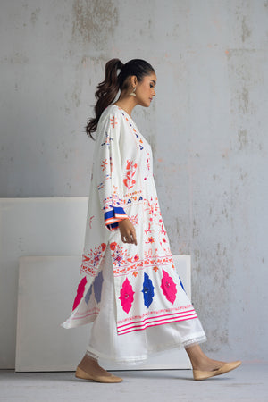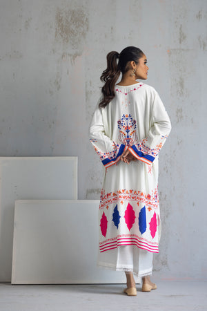 A white kurta made from crepe fabric with a stunning print features a playful combination of three colors, To add an extra touch of elegance, there's embroidery and shisha work on the neckline.