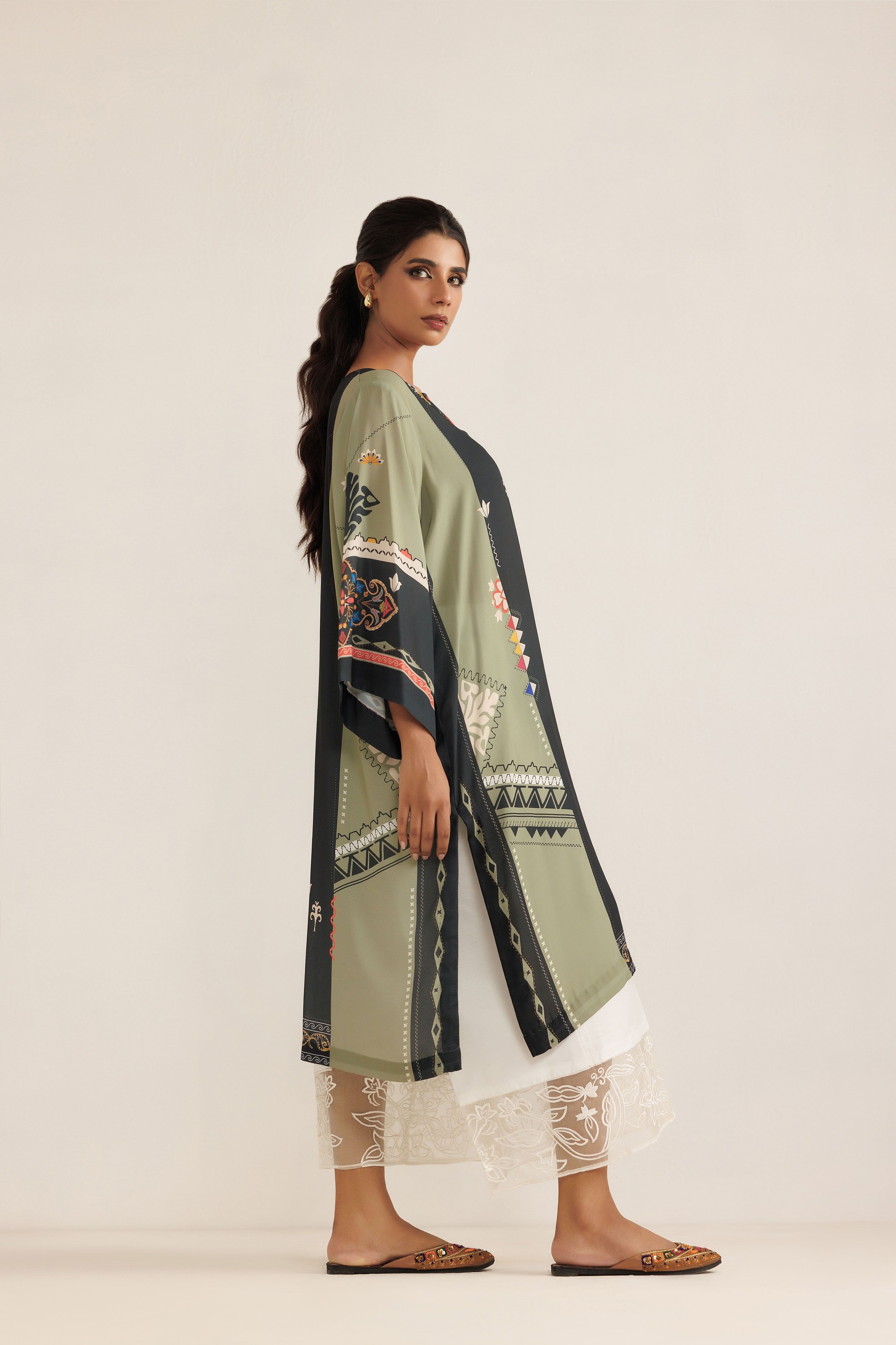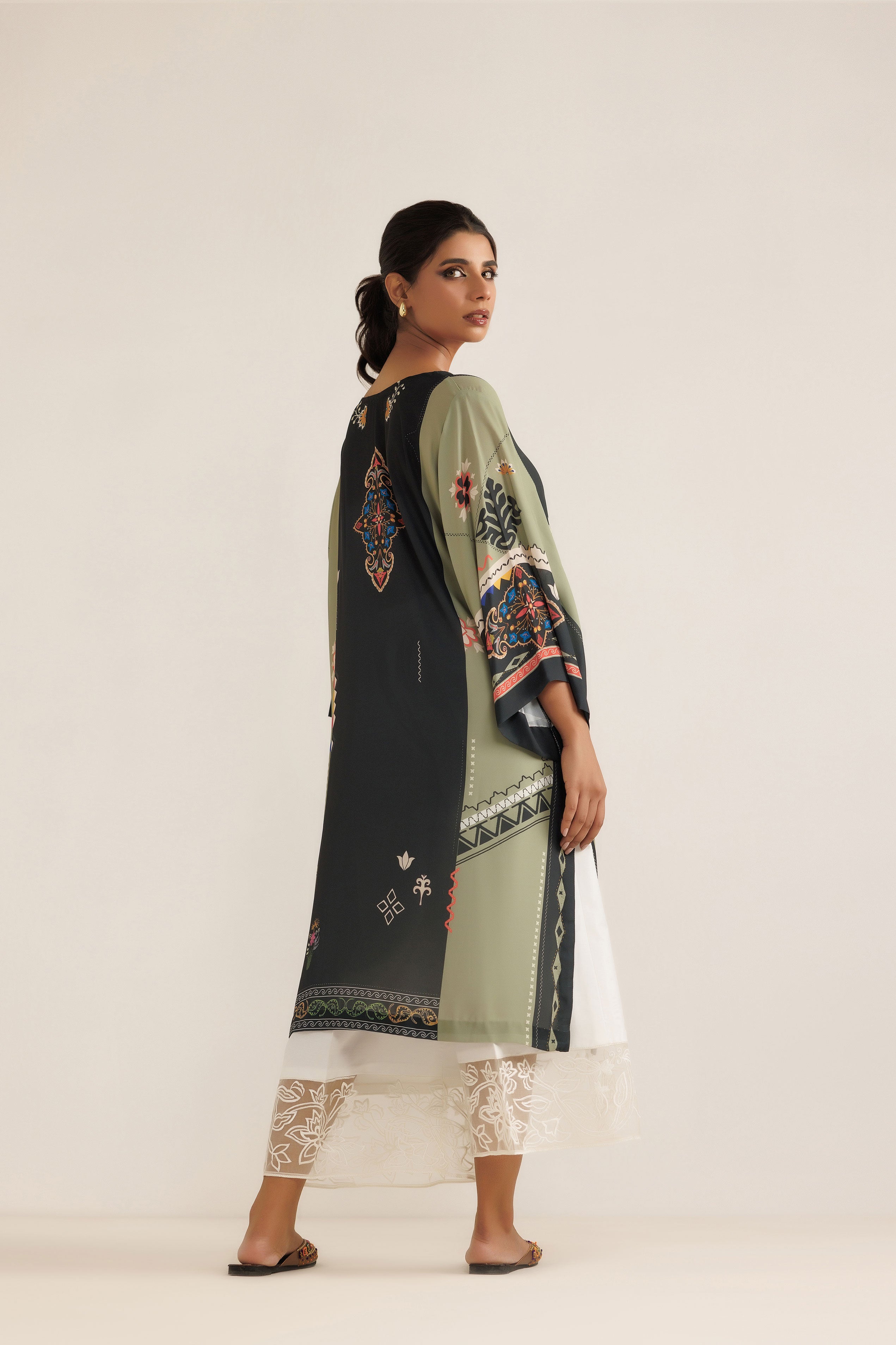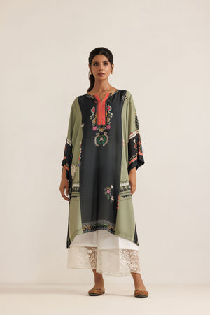 A Two-toned kurta with a striking color block panel printed, accented with a vibrant patti on the neck panel, inspired by the geometric grandeur of Mughal art. A modern take on traditional elegance.