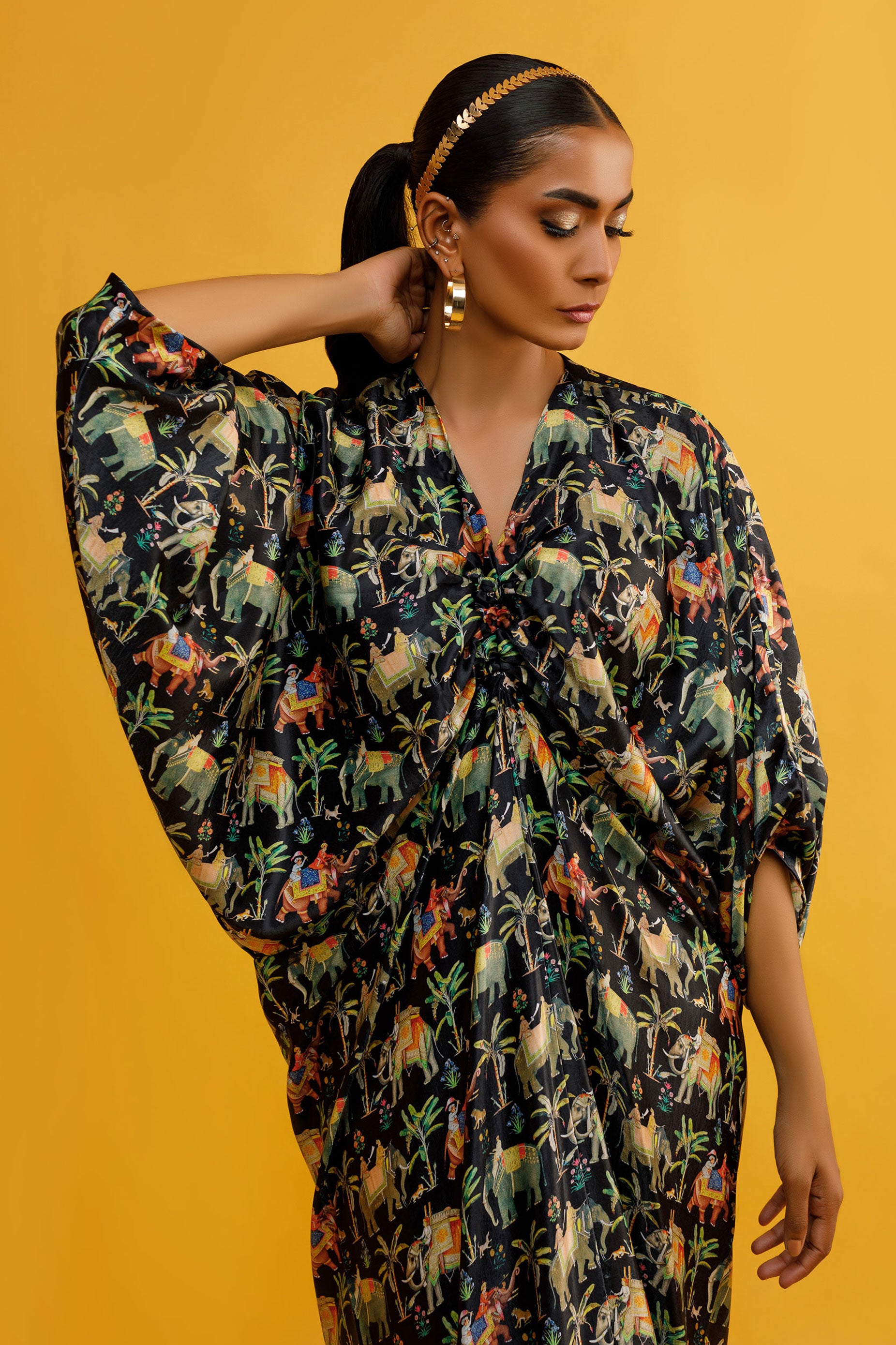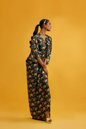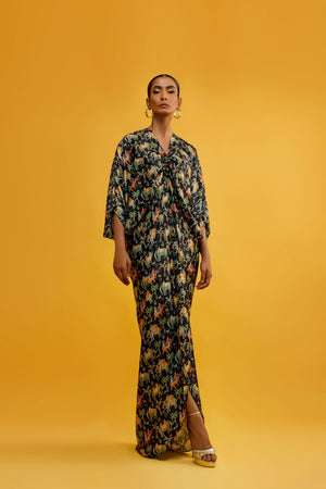 This black kaftan is stunning! The intricate black print is inspired by the beautiful Mughal miniatures, adding an artistic and cultural touch to the kaftan. The flowing silhouette and relaxed fit make it comfortable and stylish for any occasion. It's a perfect blend of tradition and modern fashion. You'll feel like royalty in that kaftan.