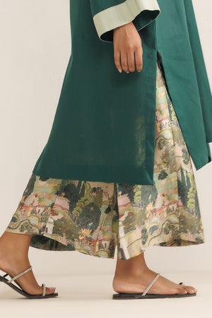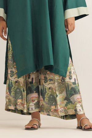 A green miniature printed silk fabric culottes create a stunning and unique look.