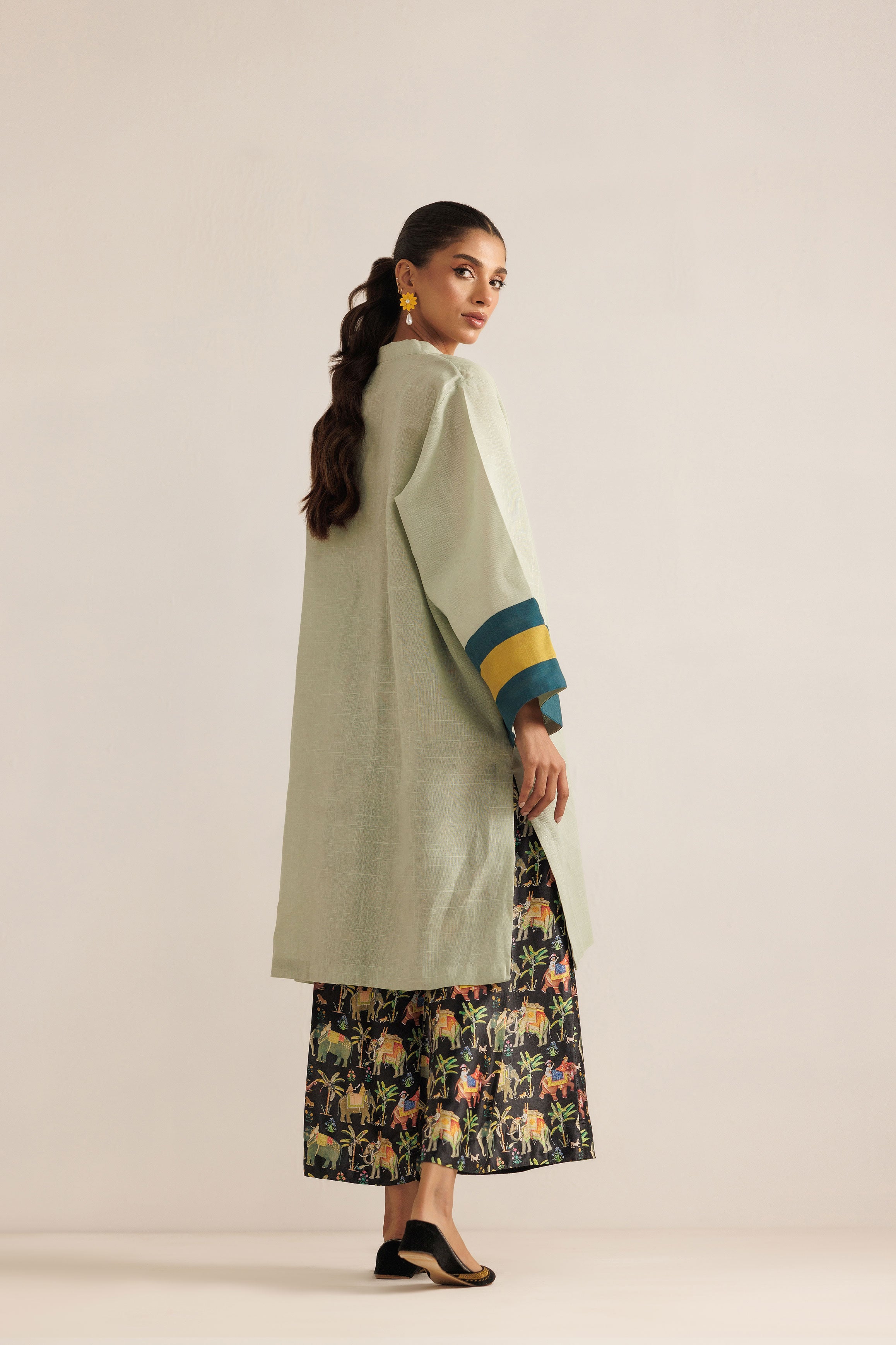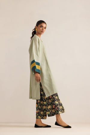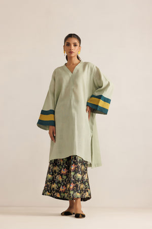A beige Irish kurta adds a touch of beauty finished with color-blocked sleeves. , Pair it with our crafted printed culottes for an elevated look, as seen here.