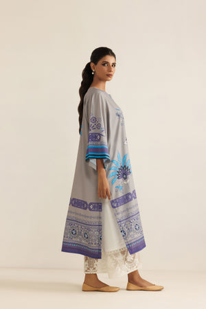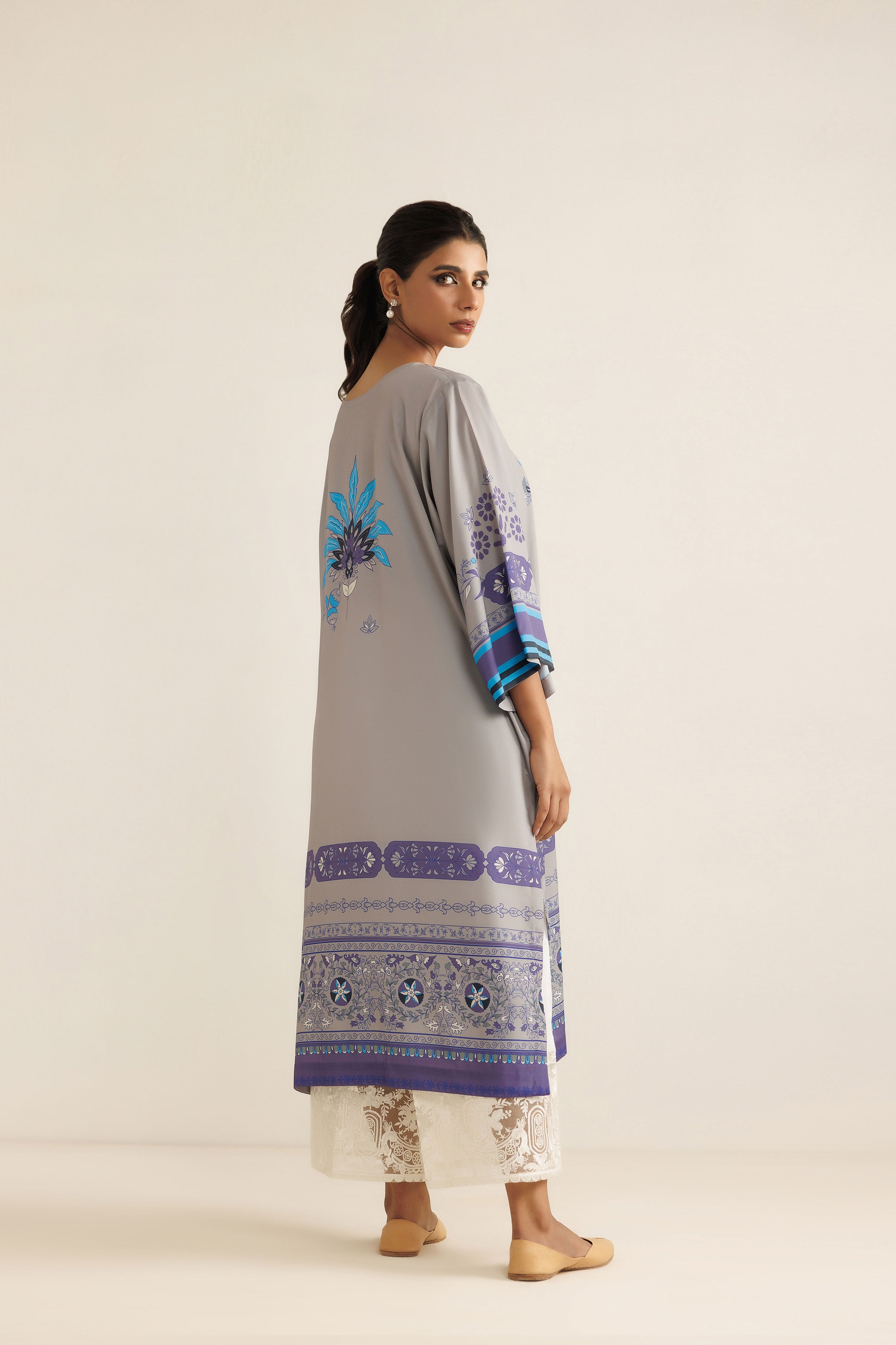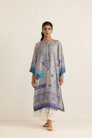 A Greyish kurta with a unique blend of monotone purples and blues print, creating a stylish and sophisticated look. A perfect fusion of subtle hues and modern design.